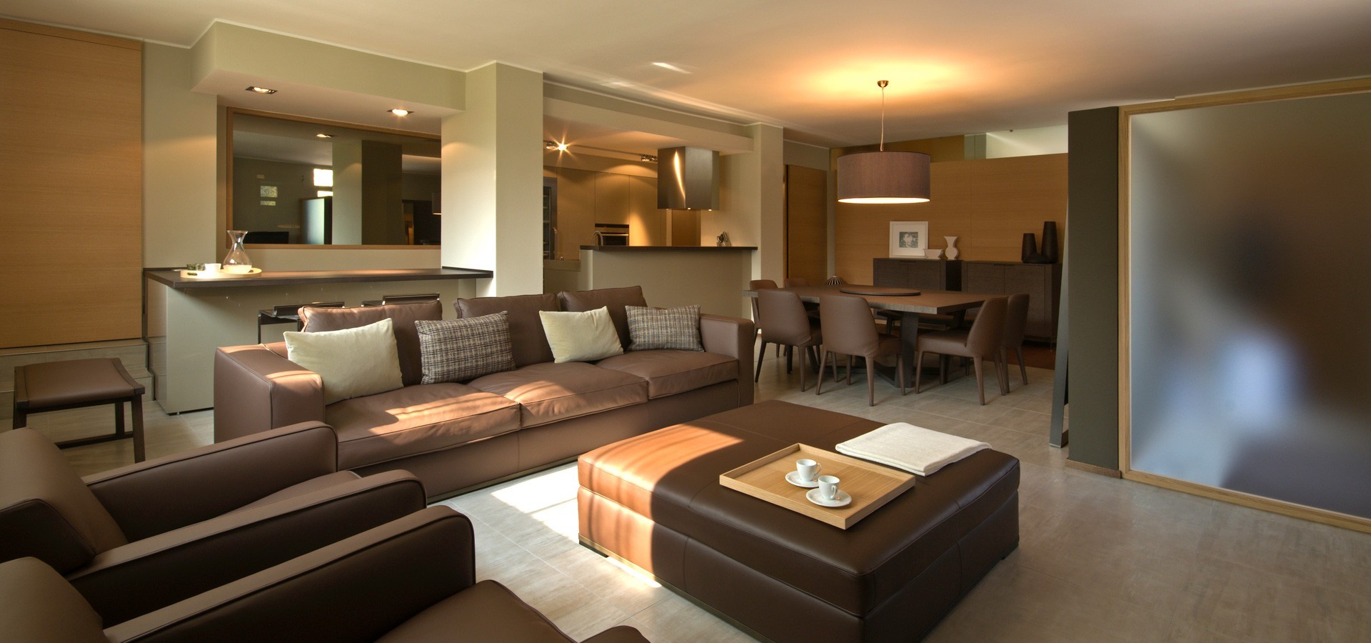 The renovation project has significantly changed an unused area on the ground floor, creating a comfortable and suggestive living room furnished with Maxalto’s wide leather seating collection Apta, and armchairs placed opposite a hearth. The kitchen and table are framed by an open space enriched with wooden boiserie painting the backdrop for refined furnishing elements of Maxalto’s Apta collection.