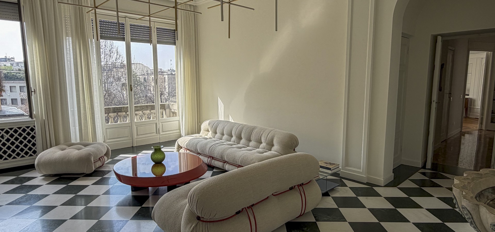 Il cuore della casa è un living luminoso affacciato sulla città, caratterizzato dal pavimento a scacchi in marmo che definisce l’identità dello spazio e valorizza una selezione di arredi contemporanei.